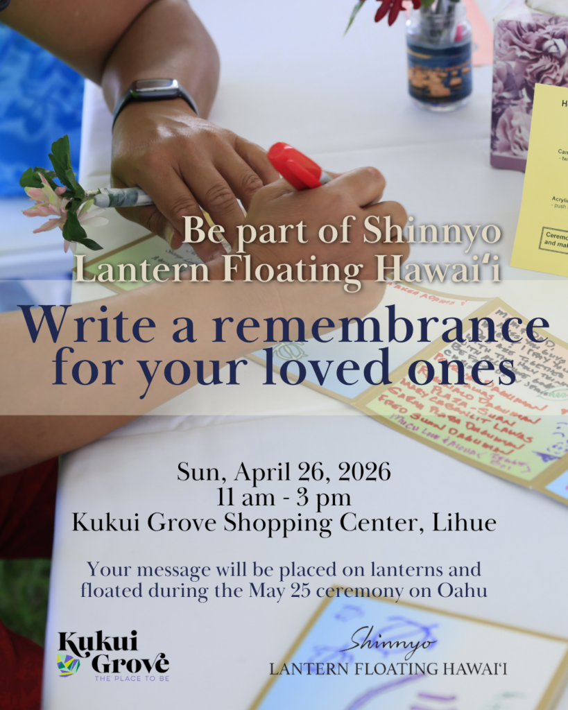 April 22, 2026 Kauaʻi residents who would like to float a remembrance message during Shinnyo Lantern Floating Hawaiʻi, but are unable to attend the ceremony on Oahu, may...
