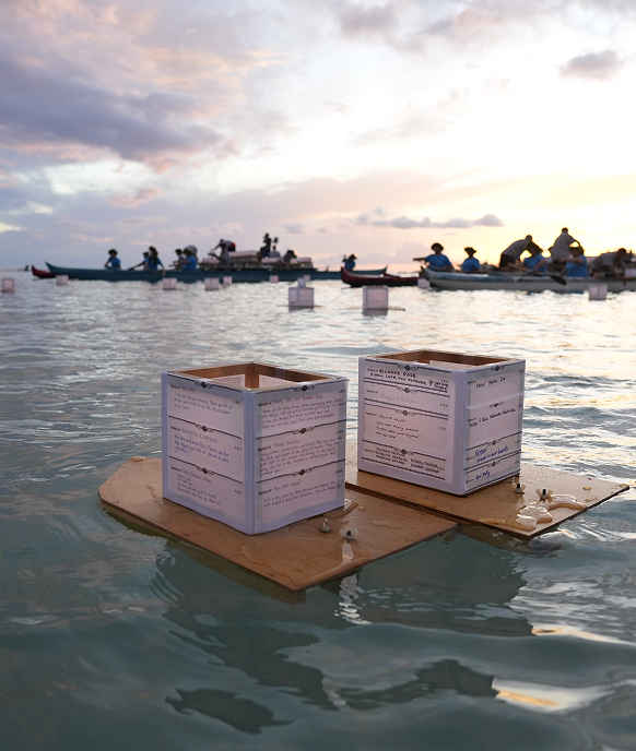 Floating the six Guiding Lanterns ensures that spirits of all will be remembered in the Shinnyo Lantern Floating Hawaiʻi ceremony. Some examples of prayers on the Guiding Lanterns are “Victims of Natural Disasters,” “Victims of Man-made Disasters,” “All Tangible and Intangible Life in All Realms Past, Present, and Future,” and “Casualties of Violence Since Settler Colonialism in Hawaii.”